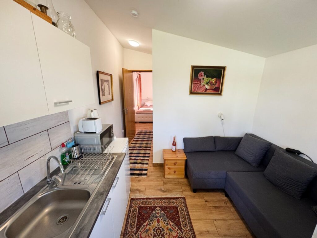 Diófa apartman (3+1 fő) A harmadik vendégház szintén egy különálló épület. Nagy teraszával különleges élményt nyújt az ide látogatóknak. A házak tájolása segít abban, hogy a területre érkező vendégek jól elkülönülve tudjanak pihenni.